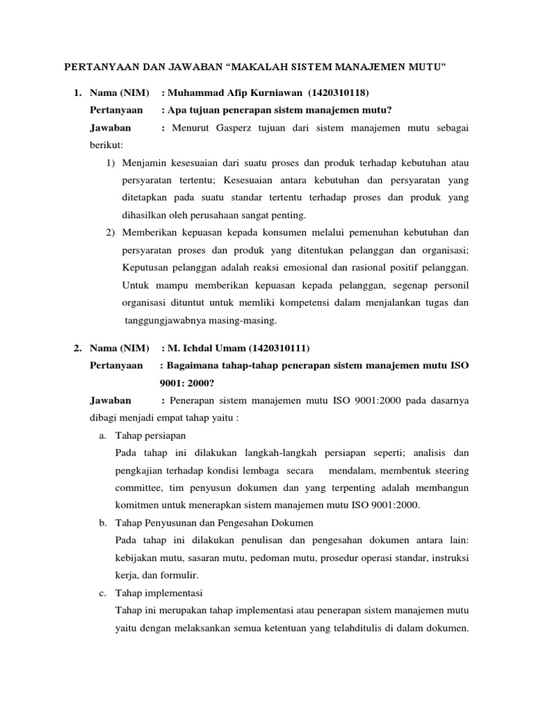 Yang perlu di ketahui seputar sistem manajemen mutu iso 9001:2015. Beberapa praktisi, pengguna serta konsultan iso 9001 tentunya pernah memunculkan beberapa pertanyaan terkait dengan iso 9001 sebagai standard paling populer di dunia. Mutu bagi sebuah lembaga pedidikan peting sekali untuk meningkatkan prestasi siswa. Mata kuliah manajemen mutu rumah sakit essay: Menurut gasperz tujuan dari sistem manajemen mutu sebagai berikut: Untuk memperoleh data penulis melakukan wawancara, observasi,. Apa yang anda ketahui tentang sni iso 9001:2008: Lisensi adalah proses administasi yang dilakukan oleh pemerintah atau yang berwewenang berupa surat izin praktik yang diberikan kepada tenaga profesi yang telah teregistrasi untuk pelayanan mandiri. Tentang manajemen mutu, tetapi masih ditemukan kekurangan di berbagai sisi. Pertanyaan internal audit iso 9001:2015 plan. Uas manajemen mutu soal 1. Buka juga soal ekonomi lain tentang ilmu manajemen. 36.tahun 2009 tentang kesehatan pada pasal 75 dan pasal 76 melarang adanya praktik aborsi tapi ada pengecualian sebutkan.