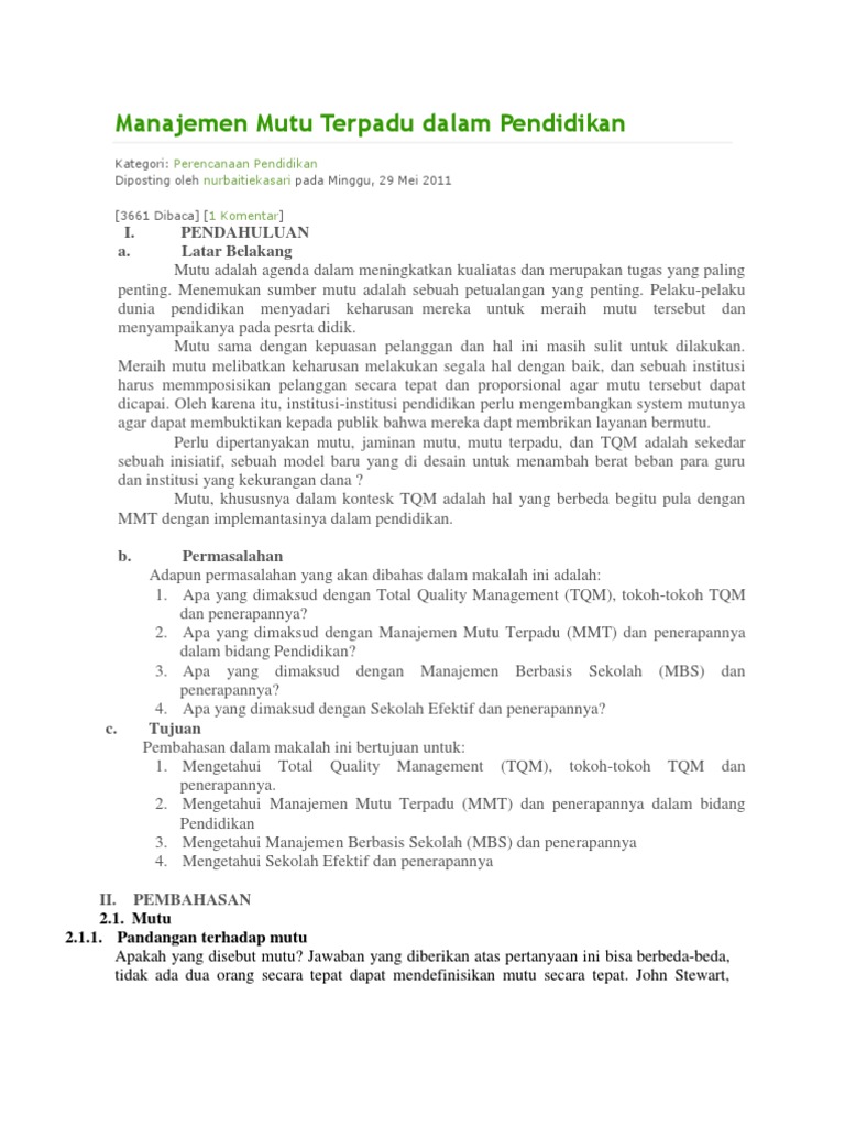 Mutu terkait langsung dengan pelanggan. Menurut gasperz tujuan dari sistem manajemen mutu sebagai berikut: • edwards deming menggunakan 14 langkah, yang kemudian dikembangkan menjadi 5 konsep, yaitu : Sni iso 9001:2008 adalah standar yang menyediakan sekumpulan persyaratan yang dibakukan untuk suatu sistem manajemen mutu, tidak peduli apa yang dilakukan organisasi pengguna, ukurannya, atau apakah swasta atau pemerintahan. Bagian atau departemennya, sehingga departemen atau organisasi sudah paham posisi organisasi/ departemen, serta sudah bersiap untuk mengantisipasi segala hal yang bisa menghambat performa organisasi ke depannya. Sekolah dapat bertanggung jawab tentang mutu pendidikan kepada pemerintah, orang tua maupun masyarakat. Contoh soal dan jawaban quality control dunia sosial. Mengapa diputuskan untuk mengeluarkan versi baru iso 9001 ? Mengingat pentingnya peranan manajemen pelayanan keperawatan, maka dalam makalah ini penulis akan menguraikan tentang pengertian, proses, dimensi, penilaian, strategi, indikator, standar, dan peran dalam menejemen mutu pelayanan keperawatan sehingga dapat menggambarkan bagaimana manajemen keperawatan yang bermutu seharusnya dilaksanakan. Ini tidak melampaui persyaratan sistem manajemen. Beberapa praktisi, pengguna serta konsultan iso 9001 tentunya pernah memunculkan beberapa pertanyaan terkait dengan iso 9001 sebagai standard paling populer di. Mutu bagi sebuah lembaga pedidikan peting sekali untuk meningkatkan prestasi siswa. Pengertian manajemen mutu terpadu manajemen mutu terpadu merupakan, sistem manajemen yang.